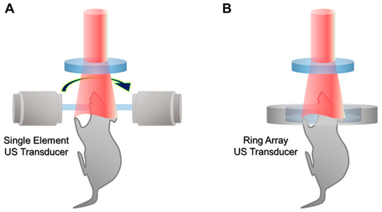 In the initial stage, PACT uses the rotational scanning of a single-element transducer to achieve PA waves in multiple directions (Figure 4A). The initial systems showed promising results for visualizing tomographic images of mice, especially the brain [48,49]. However, the traditional rotational scan suffers from slow imaging speed and a relatively complex system configuration. Recently, array transducers in the shape of rings or arcs have been investigated to enhance imaging speed (Figure 4B) [50,51,52]. Since the array transducers can achieve PA signals in multiple directions at once, the imaging speed of PACT can be greatly increased; even real-time imaging is possible [53]. In addition to the ring array transducer, PACT adopts various types of transducers, such as linear [54], hemispherical [55], planar [56], and bowl [57] transducers. The array transducers enable PACT to acquire 2D or 3D images with much faster imaging speeds compared to traditional systems with the scanning of single-element transducers.