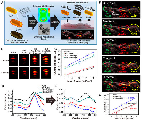 Moon et al. investigated the potential of rGO-coated AuNRs (rGO–AuNRs) for sensitive PAI and PTT applications (Figure 5) [103]. Owing to the excellent NIR light adsorption properties of rGO–AuNRs, PA signal intensity increased up to 1.5-fold compared to bare AuNR at the mouse intradermal. Theological studies revealed that a 4-times higher magnitude of electromagnetic field was generated compared to bare AuNRs or GO–AuNRs. High PA amplitudes were observed in the 4–11 MHz range, which is the operating frequency of the ultrasound transducer, suggesting the fabricated rGO–AuNRs can be a multimodal deep-tissue imaging probe.