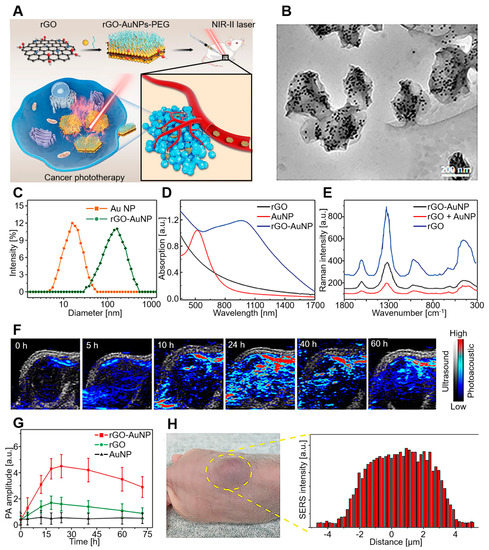 - Wang, Z.; Sun, X.; Huang, T.; Song, J.; Wang, Y. A Sandwich Nanostructure of Gold Nanoparticle Coated Reduced Graphene Oxide for Photoacoustic Imaging-Guided Photothermal Therapy in the Second NIR Window. Front. Bioeng. Biotechnol. 2020, 8, 655. [Google Scholar] [CrossRef] [PubMed]