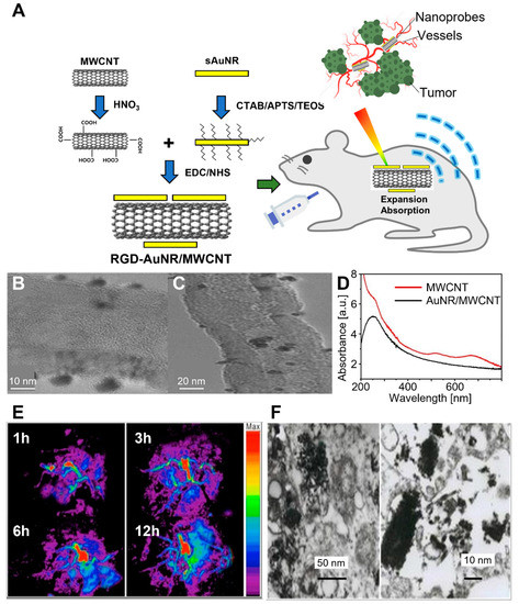 RGD–AuNR/MWCNT conjugate for targeted PAI of gastric cancer. (A) Schematic diagram of synthesis and application of RGD–AuNR/MWCNT in mouse gastric cancer vessel visualization. (B) TEM and (C) HR–TEM images of AuNR/MWCNT. (D) UV–vis spectra of pristine MWCNT and AuNR/MWCNT. The inset shows the magnification in the region of 400~800 nm. (E) Photoacoustic images of different post-injection times. (F) TEM images of RGD–AuNR/MWCNT inside the MGC803 cells. The images are reproduced with permission from ref. [142].