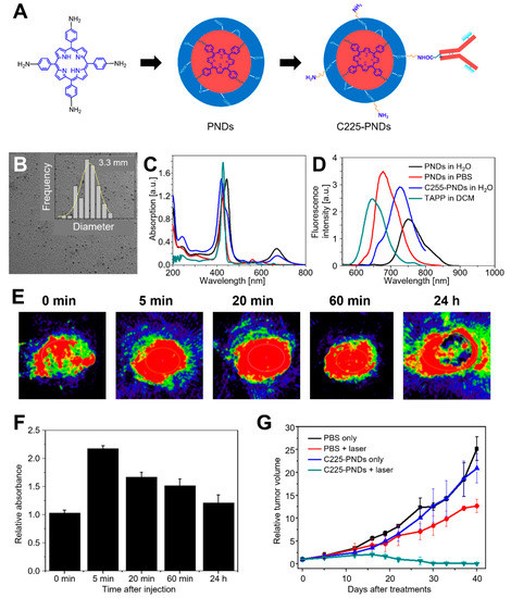 To magnify the PA signal of CD-based probes, many porphyrin photosensitizers are utilized [163,164]. However, many of them are limited in clinical application due to prolonged cutaneous photosensitivity, poor water solubility, and low selectivity and fluorescence quantum yield. To overcome these issues, Wu et al. developed porphyrin- and cetuximab-containing CNPs (C225–PNDs) through the supramolecular self-assembly of lipid- or peptide–porphyrin conjugates (Figure 8) [165]. The fabricated C225–PNDs showed excellent stability and biocompatibility with the characteristic properties of porphyrin, which are strong UV–visible and NIR light absorption. The C225–PNDs could actively target EGFR-overexpressed cancer cells, leading to highly efficient PDT upon two-photon excitation at 800 nm laser irradiation. Moreover, PAI-guided PDT on MDA-MB-231 breast tumor-bearing mice showed complete tumor ablation, indicating the clinical potential of C225–PNDs.