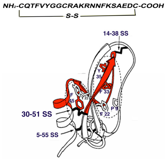 Peptide 30–51 SS (in red) comprising a large part of the second and third β-sheets and part of the α-helix of Aprotinin. Aminoacidic sequence at the top of the figure.