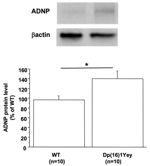 There are three independent mouse regions homologous to HSA21, the largest region is found on mouse chromosome 16 (MMU16), which contains the gene encoding DYRK1A. Therefore, we used the Dp(16)1Yey mouse model, which carried the duplication of the entire mouse chromosome 16 (MMU16) region syntenic to HSA21 [23]. ADNP protein level was increased in the brain of Dp(16)1Yey compared to WT mice (Figure 1). To show if the increased ADNP level is due to DYRK1A overexpression, we used a transgenic line overexpressing DYRK1A, the mBACtgDyrk1A mouse model [22]. The level of protein ADNP was also found to be increased in brain of mBACtgDyrk1A mice (127.6 ± 9.7 vs. 100 ± 4, n = 8 for each group, p < 0.05). Furthermore, a positive correlation was found between the ADNP and DYRK1A protein level (p < 0.02 with a ρ = 0.615).