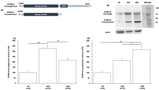 Recent studies have demonstrated that the protein DYRK1A is truncated in symptomatic AD. Rge C-terminal truncated protein has stronger activity than its full-length form in promoting Tau phosphorylation [26]. This increase in the truncated form is also associated with a decrease in the level of the full-length form [26,27]. Using the anti-Dyrk1A antibody 7D10 targeting the C-terminal region of DYRK1A (Figure 2a), we observed a decrease in the level of full-length form in LCLs from dDS patients compared to level in LCLs from aDS patients (117 ± 23 vs. 227 ± 34) (Figure 2b,c). In turn, this level was increased in LCLs from aDS patients when compared to euploid healthy individuals (227 ± 34 vs. 100 ± 17) (Figure 2b,c). Therefore, we performed Western blot analyses using the D1694 antibody targeting the N-terminal region of the protein DYRK1A (Figure 2a) and observed a decreased level of the full-length form of DYRK1A with an increased level of the truncated form (50 kDa) in LCLs of patients with dDS compared to the level in LCLs from individuals with aDS (317 ± 37 vs. 214 ± 22) (Figure 2b,d), the level of this truncated form being increased in LCLs of patients with aDS compared to the level in LCLs from euploid healthy individuals (214 ± 22 vs. 100 ± 15 (Figure 2d). Unfortunately, it was not possible to detect ADNP in LCLs.