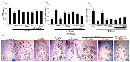 Effects of Pangasius hypophthalmus fish skin hydrolysates (fsCH) on serum osteoprotegerin (OPG)/receptor activator of the nuclear factors κB ligand (RANKL) ratio (A–C), and TRAP localization in femoral bone tissue sections of OVX mice (D). Ovariectomized (OVX) C57BL/6 female mice were orally administrated with 2 mg/kg isoflavone, 15 mg/kg glycine–proline–hydroxyproline tripeptide (GPH), 206 mg/kg calcium lactate, and 206–618 mg/kg Pangasius hypophthalmus fish skin hydrolysates (fsCH) daily for 8 weeks. Serum levels of OPG and RANKL were determined by using ELISA kits (A–C). Respective values in bar graphs (mean ± SEM, n = 9) not sharing an alphabetical lowercase (a–d) are different at p < 0.05. The TRAP staining of longitudinal femoral bone tissues was conducted by using a leukocyte acid phosphatase kit (D). TRAP-positive osteoclasts (purple) are observed at the femoral trabeculae. Scale bar = 200 μm. Representative images were visualized under light microscopy.