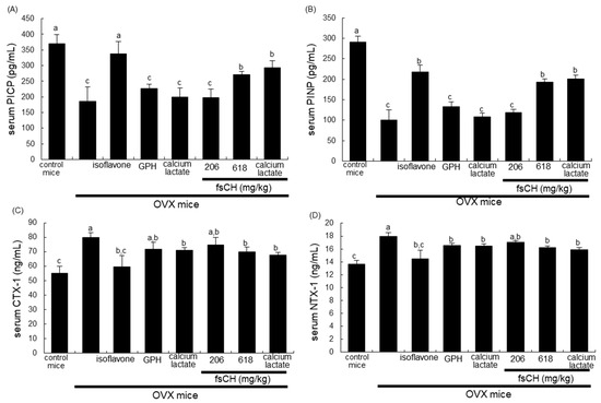The current study investigated beneficial effects of fsCH on collagen formation in OVX mice. The PICP and PINP proteins are liberated in equimolar concentrations into the circulation during the during collagen synthesis [37]. The most abundant protein in bone is type 1 collagen. The OVX reduced serum levels of PICP and PINP in mice, as evidenced by ELISA (Figure 3A,B). The treatment with 618 mg/kg fsCH and isoflavone significantly elevated the serum levels of these propeptides reduced by OVX. In addition, orally supplying combined fsCH and calcium lactate to mice synergically increased serum levels of PICP and PINP (Figure 4A,B). Accordingly, the presence of fsCH may ameliorate collagen synthesis in bone deteriorated by estrogen deprivation.