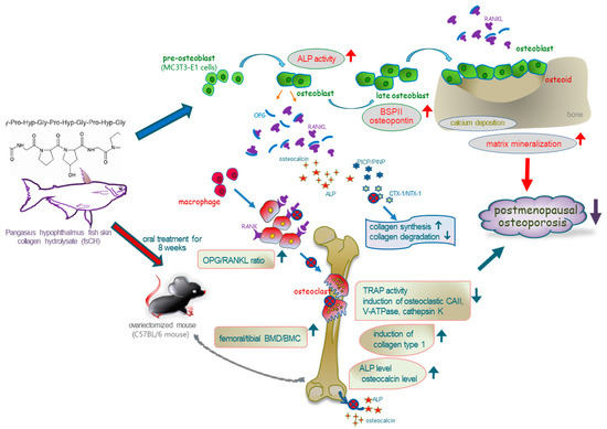 Schematic diagram showing effects of Pangasius hypophthalmus fish skin hydrolysates (fsCH) on bone loss and osteoblastogenesis in ovariectomized mouse model. The arrows indicate activation by fsCH. ALP, alkaline phosphatase; BMD, bone mineral density; BSPII, bone sialoprotein II; CAII, carbonic anhydrase II; CTX-1, carboxy-terminal telopeptide of type 1 collagen; GPH, glycine–proline–hydroxyproline; NTX-1; amino-terminal telopeptide of type 1 collagen; OPG, osteoprotegerin; PICP, procollagen type 1 carboxy-terminal propeptide; PINP, procollagen type 1 amino-terminal propeptide; TRAP, tartrate-resistant acid phosphatase; RANK, receptor activator of nuclear factor-κB; RANKL, RANK ligand; V-ATPase, vacuolar-type H(+)- ATPase. The symbol → indicates activation manifested by fsCH and the symbol ⊗ indicates sites of inhibition.