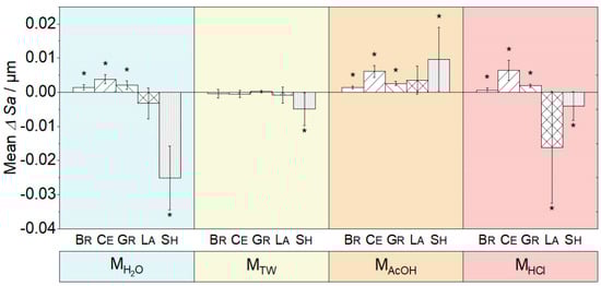 Changes in the mean and standard deviation of the surface roughness (Sa) (t1−t0) due to immersion in the different media MH2O (demineralized water), MTW (tonic water), MAcOH (acetic acid) and MHCl (hydrochloric acid) (* indicates p < 0.05).