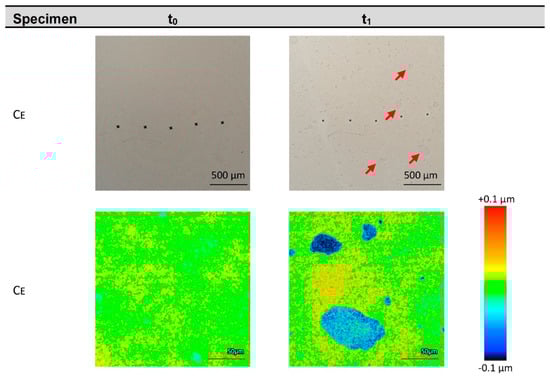 Surface of the Ce specimen before (t0) and after (t1) immersion in MHCl. Above: Ce overview images of the same specimen location (the five pyramidal indentations of the hardness determination were used as orientation). Multiple darker spots manifested on the Ce surface (see red arrows at top right) due to immersion in MHCl. Surface rendering revealed that the spots are depressions. Below: height-scaled false colours.