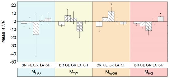 The mean changes in HV values ΔHV (t1−t0) presented no significant changes after storage in MH2O and MTW (Figure 3). Through exposure to MAcOH, Gr experienced the maximum increase in ΔHV of +12.9 (p ≤ 0.047). The highest changes occurred after exposure to MHCl: Br (ΔHV = −2.4) and Ce (ΔHV = −5.2; maximum decrease), which was significant (p ≤ 0.044), whereas HV for Sh increased by +6.3 (p < 0.001).
