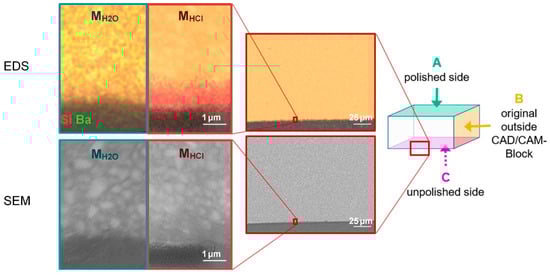 However, the cross sections at the edge of the unpolished side C showed clear differences between Ce stressed in MH2O and MHCl in terms of morphology and elemental distribution (Figure 4). While SEM images of different edges stressed in MH2O revealed no differences, Ce stressed in MHCl had a zone of approximately 2 µm distance from the edge with particles that were less radiopaque than the more inward particles. The EDS mappings of the area confirmed the absence of titanium, aluminium, and barium in this layer, while the distribution of the other elements remained the same.