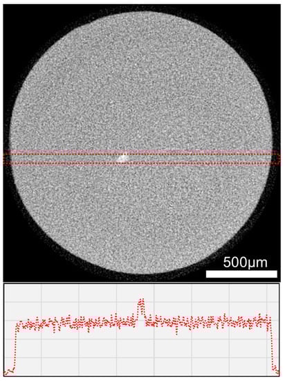 A directional X-ray tube “FXE 225.99” (200 kV, 150 µA, focal spot 0.6 µm, tungsten target) from YXLON International GmbH and a 2D-detector “1621 N” (2048 × 2048 pixels, CsI, pitch 200 µm) from PerkinElmer Inc. were used to analyse the cylindrical samples (Ø 2 mm) of selected material Ce before and after the stress caused by MHCl. The edge length of the voxels was 2.83 µm3. The raw data were cut, oriented, and calibrated with ImageJ (National Institutes of Health, 1.51d, Bethesda, MD, USA) in accordance with Koenig (2020) [].