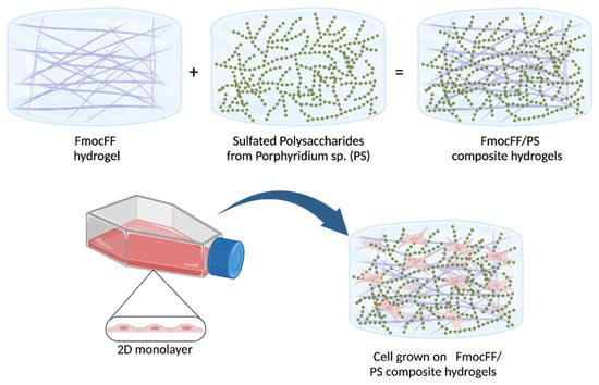 Polysaccharides in general and polysaccharides from Porphyridium sp. are often modified and strengthened by cross-linking, chemical coating, and the addition of synthetic materials. However, their degradation may result in the release of toxic products [20]. Short aromatic peptides, particularly fluorenylmethoxycarbonyl-diphenylalanine (FmocFF), have been recently proposed to reinforce natural polysaccharides to produce scaffolds for tissue culture, bone regeneration and sustained release of bioactive molecules [21,22,23]. Unlike conventional polymeric hydrogels based on a covalently cross-linked polymer network, short aromatic peptides can form self-supporting nanostructured supramolecular hydrogels through noncovalent interactions of the molecules in a self-assembly process [24]. When combined with sodium alginate, hyaluronic acid, or konjac glucomannan, FmocFF peptide has been shown to increase their rigidity and stability, resulting in ECM-mimicking hydrogel biomaterials for potential use in tissue engineering and drug delivery [21,22,25,26].