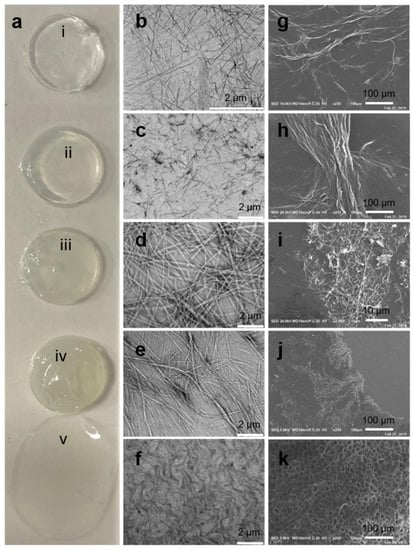 TEM and SEM analyses demonstrated the nanofibrillar architecture of the composite hydrogels (Figure 2c–e, h–j, respectively), similar to the nanofibrous architecture of FmocFF alone (Figure 2b,g).