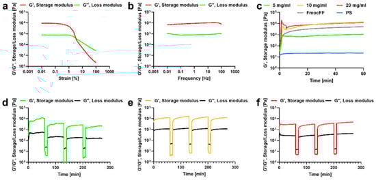 Rheology of the FmocFF/PS hydrogels. (a) Strain sweep of the 10 mg/mL FmocFF/PS composite hydrogel. (b) Frequency sweep of the 10 mg/mL FmocFF/PS composite hydrogel. (c) In situ time sweep oscillation measurements of the FmocFF, PS, and composite FmocFF/PS hydrogels. (d) Time sweep of the 5 mg/mL FmocFF/PS composite hydrogel under alternate step strain switched from 0.1% to 100%. (e) Time sweep of the 10 mg/mL FmocFF/PS composite hydrogel under alternate step strain switched from 0.1% to 100%. (f) Time sweep of the 20 mg/mL FmocFF/PS composite hydrogel under alternate step strain switched from 0.1% to 100%.