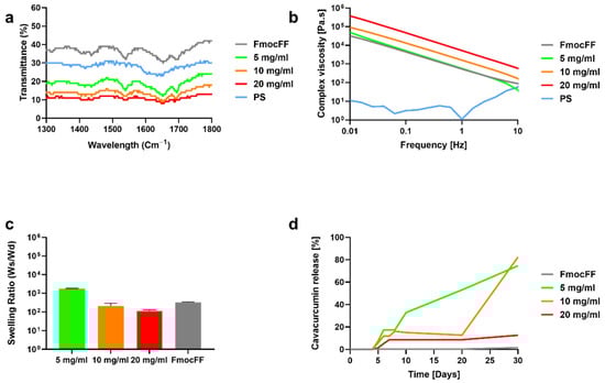 Structural and mechanical characterization of the composite FmocFF/PS hydrogels. (a) FTIR spectra of FmocFF/PS composites, FmocFF and PS. (b) The complex viscosity (η”) versus frequency plots of the pure and composite samples. (c) Swelling ratio of the FmocFF/PS composite hydrogels and FmocFF. Data analyzed using one-way ANOVA. (d) Curcumin release profile from FmocFF and the composite FmocFF/PS hydrogels.
