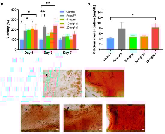 The 20 mg/mL FmocFF/PS hydrogel induced significantly higher calcium deposition in MC3T3-E1 preosteoblasts grown in osteogenic media compared to cells grown on tissue culture plastic (p = 0.0360) (Figure 5b). This result was confirmed by the Alizarin red staining (Figure 5c–g). The staining intensity was higher as the hydrogel concentration increased (Figure 5e–g).