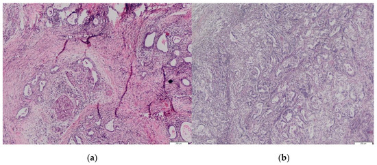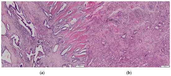 (a) Histopathological specimen of pancreatic tail tissue with well- and moderate-differentiated ductal adenocarcinoma. (b) Posterior stomach wall tissue with well- and moderate-differentiated ductal adenocarcinoma. Identical morphology with a primary pancreatic tumor. No signs of primary gastric adenocarcinoma. Hematoxylin/Eosin.