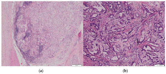 (a) Histopathological specimen of pancreatic tissue with well-differentiated ductal adenocarcinoma of pancreatic head. (b) Pyloric tissue with well-differentiated ductal adenocarcinoma of pancreatic origin, identic morphology with primary pancreatic tumor. No signs of a primary gastric adenocarcinoma. Hematoxylin/Eosin.