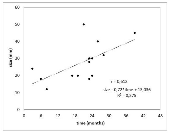 Literary research and subsequent evaluation pointed out 30 published cases of PDAC GSM. Complete information for the progression analysis of seeded tumors was gained in 14 cases, as shown in Figure 4. All cases of seeding/needle tract metastases are illustrated in Table 3. There was a moderate positive correlation between size and time (r = 0.612). The regression coefficient b = 0.72 is significantly non-zero (p = 0.020) and expresses an increase by 0.72 mm in one month.