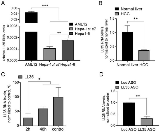 Our previous data demonstrated the prevalent expression of LL35 lncRNA gene (9020622O22Rik) in murine liver and lungs [22]. To estimate the role of LL35 in the physiology of hepatocytes we compared the expression levels of LL35 in a normal murine hepatocyte cell line (AML12) and two hepatoma cell lines (Hepa 1-6 and Hepa-1c1c7) by RT-qPCR. We revealed that the LL35 RNA level is much higher in AML12 in comparison with both hepatoma cell lines (Figure 1A). A lot of studies have shown that the deregulation of lncRNAs is associated with the development and progression of various cancers, which makes them suitable biomarkers for cancer diagnosis and prognosis [41].