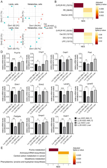 Lipidome and metabolome analysis of AML12 cells and murine liver after LL35 inhibition. (A) PCA of lipids and metabolites from AML12 cells and liver samples with depleted LL35 (LL35 ASO) and control (Luc ASO), polarities merged. Lipid abundance alteration in (B) AML12 cells; (C) murine liver, classes that are significant both before and after confirmation (fgsea FDR < 10%). Numbers in brackets: the number of confirmed features and the total number of features. (D) RT-qPCR analysis of expression levels of key genes, which participate in synthesis and breakdown of significantly changed lipids classes after LL35 knockdown (LL35 ASO) and control (Luc ASO), normalization on ACTB gene. (E) KEGG pathways, metabolites from which are significantly influenced by LL35 knockdown in AML12 cells. NES—normalized enrichment score. Results show mean ± SD. ns—not significant. * p < 0.05, ** p < 0.01 and *** p < 0.001.