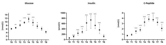 Levels of glucose, insulin, and C-peptide at baseline (T0) and for 180 min following an oral glucose load in prediabetic patients. Data are expressed as median and interquartile range. n = 18; * p < 0.05, ** p < 0.005, *** p < 0.0005 vs. T0.