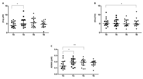 Levels of (A) arginine (Arg), (B) ratio ornithine and citrulline (Orn/Cit), and (C) asymmetric dimethylarginine (ADMA) at baseline (T0) and for 180 min following an oral glucose load in RBCs isolated from prediabetic patients. ● T0; ■ T4; ▲ T6; ▼ T8. Data are expressed as median and interquartile range. n = 18; * p < 0.05, ** p < 0.005.