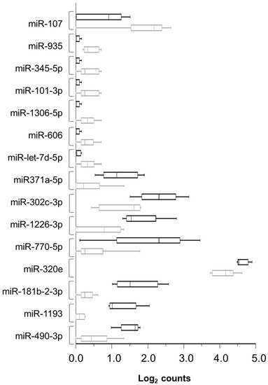 The expression of dysregulated miRNAs in serum from RCD2 and RCD1 patients. The box plot showed the levels of expression of 15 miRNAs analyzed by Nanostring Technologies and by nSolver Analysis Software 4.0. The black boxes indicate samples from RCD2 subjects, and the grey boxes, the samples from RCD1 patients. The median and quartile distribution are plotted.