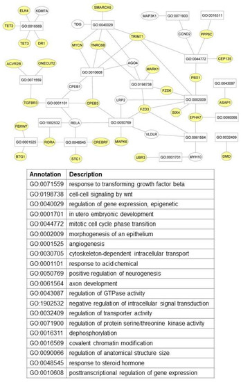 Note that the best categories, taking as the threshold an enrichment ratio > 2, were in response to transforming growth factor β with 32/238 genes of the set; cytoskeleton-dependent intracellular transport with 21/170; the regulation of gene expression with 30/258; in utero embryonic development with 36/345; and, finally, cell–cell signaling by Wnt with 47/460 (see Supplementary Material File S2). As a miRNA can target multiple genes, and the same gene can also be affected by more than one miRNA, we focused the succeeding investigations into 39 genes targetable by more than one miRNA. In our opinion, these represent the core of possible impacted transcripts. As summarized in Supplementary Material Table S3 [17,18,19,20,21,22,23,24,25,26,27,28,29,30,31,32,33,34,35,36,37], we have associated each target gene with putative specific functions, with 29 of them being validated in the literature.
