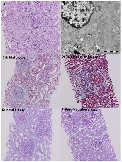 Patient 1 (A,B). Patient with SLE with normal renal function, 24-h proteinuria of 0.2 g/day, and minimal microscopic hematuria. Kidney biopsy shows severe, proliferative LN with crescent formation, and an activity index of 14 ((A), haematoxylin eosin staining, magnification 20×), with extensive mesangial and subendothelial immune complex deposition ((B), electron microscopy, magnification 11,000×). Patient 2, post-induction repeat biopsy (EUROLUPUS regimen). Initial biopsy, (C) (Masson staining, magnification 20×) and (E) (PAS staining, magnification 20×), show severe, proliferative LN with an activity index of 16 at baseline. Repeat biopsy, (D) (Masson staining, magnification 20×) and (F) (PAS staining, magnification 20×), show a significant histologic improvement with a decrease of the activity index to 2. (Images from the Renal Biopsy Registry of Fundeni Clinical Institute, Bucharest, Romania).