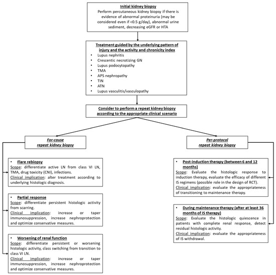 The role of repeat kidney biopsy has been increasingly recognized over the past decades as an invaluable tool to assess the histological stratification and adjust immunosuppressive therapy in patients with LN [2]. Nonetheless, despite the fact that several scenarios in relation to the moment of the repeat biopsy have been described, there is little consensus on the optimal approach [50]. The first scenario is for-cause repeat kidney biopsy performed in the following settings: persistent proteinuria (to differentiate persistent histologic activity from scarring), the progressive increase of serum creatinine or treatment unresponsiveness, and flare rebiopsy [50]. The second scenario is per-protocol repeat kidney biopsy, post-induction therapy (to assess treatment response), and during maintenance therapy (to assess the optimal moment for IS withdrawal) [50].