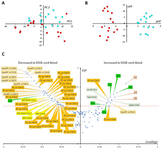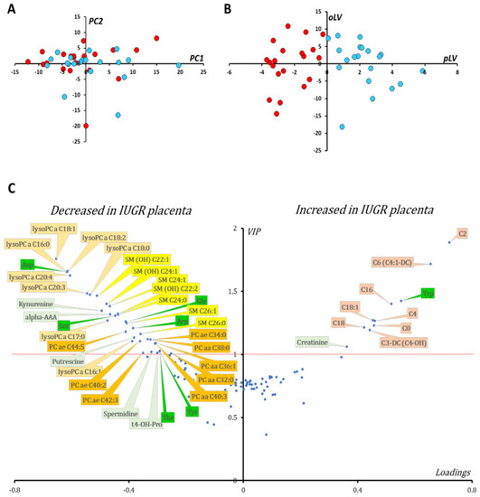 Metabolites were scaled to have zero mean and unit variance (UV scaling) before submission to unsupervised and supervised algorithms. Principal component analysis (PCA) and orthogonal projection to latent structures-discriminant analysis (OPLS-DA) were the unsupervised and supervised methods used in multivariate analysis. PCA enables outlier detection, based on Hotelling’s T2 distance, and identification of similar samples grouping together in the scatter plot. In the supervised analysis, the X matrix of predictive variables was composed of metabolite concentrations and the Y vector contained the information relative to the group (control or IUGR). To avoid selecting optimistic but over-fitted models, the predictive capabilities of the OPLS-DA models were evaluated by cross-validation using cross-validated R2Y (Q2Ycum or goodness of prediction), the cross-validated analysis of variance (CV-ANOVA) test, and the goodness of prediction of permuted models (Q2Y cum-perm). Models with a low degree of over-fitting are characterized by Q2Ycum > 0.5, negative Q2Y cum-perm and are significantly more discriminant than the null model (p-value CV-ANOVA < 0.05). In predictive models, selection of metabolites of interest was made through the combination of two pieces of information: variable importance in the projection (VIP) and the loading between the metabolite in the X matrix and the predictive latent variable(s) of the OPLS-DA models. Only metabolites with a VIP value larger than 1 and absolute high loading values were considered as important in the metabolomics signature.