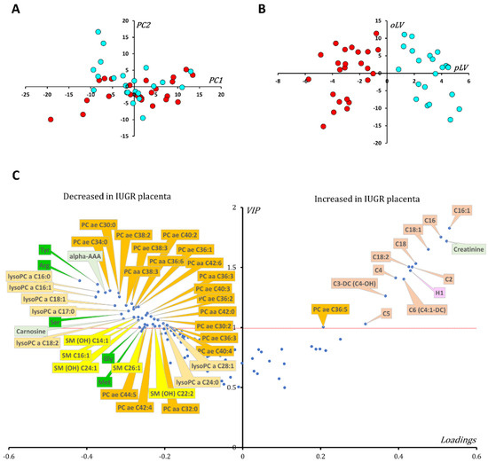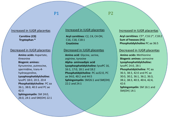 The Student’s t-test was used to compare the metabolite concentrations in placenta and newborn cord blood samples for the IUGR and control groups. The non-parametric Mann–Whitney–Wilcoxon test was used to compare metabolite sums and ratios between these cohorts. The Benjamini–Hochberg correction was applied to account for risk I inflation associated with multiple comparisons.