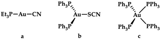Different coordination geometries of Au(I) complexes with coordination number (a) 2, linear; (b) 3, trigonal planar; and (c) 4, tetrahedral.
