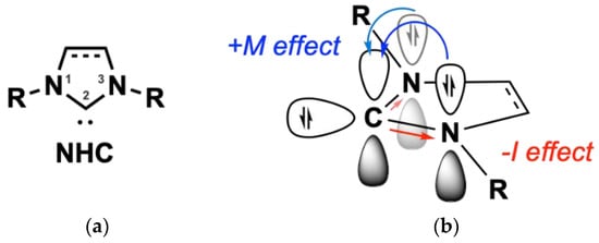 (a) Electronic stabilization of NHC of the free carbene electrons in C2 position (b) via σ-withdrawing and π-donating effects of the nitrogen heteroatoms. Reprinted with permission from Ref. []. Copyright (2021) Wiley-CVH.
