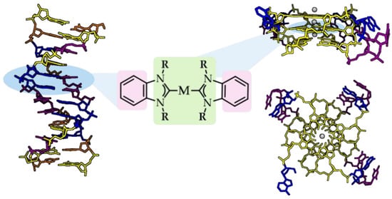 In general, organometallic NHC complexes are not highly regarded for their binding affinity towards nucleic acids; nevertheless, their rational design to form aromatic/ planar moieties can impact their reactivity with canonical and non-canonical DNA secondary structures [,]. Rationally designed quadruplex-intercalating ligands should meet certain rules, such as possessing: (1) a flat and monocationic molecular structure capable of interacting with the negatively charged DNA; (2) one or ideally two antidiametric aromatic systems prone to interacting with guanines via π-stacking; (3) side chain water-solubilizing ligands, and (4) a metal center that can non-covalently interact with the carbonyl edges of the G-quartet over the central cation channel (Figure 7) [,].