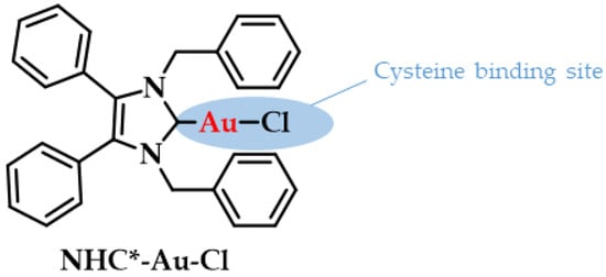 Chemical structure of NHC*-Au-Cl highlighting the albumin binding site. Adapted with permission from Ref. []. Copyright (2018) Wiley-VCHVerlag GmbH & Co. KGaA, Weinheim.