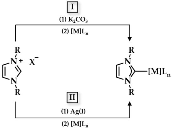 Synthesis routes towards NHC complexes I via mild base and II transmetalation with Ag2O.