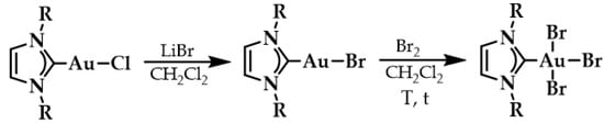 NHC-Au(III) complexes on the other hand are commonly synthesized through the oxidation of its Au(I) precursor. A common approach was reported by Raubenheimer and coworkers in 1997, and ten years later a similar synthesis was described by Nolan et al. A direct oxidative addition reaction between a dihalogen (Cl2, Br2, I2) and a cationic bis(carbene) Au(I) complex was achieved in dichloromethane (Figure 10), affording the desired NHC-Au(III) complex [,]. One of the recent approaches involved simple reflux reactions among Au precursors bearing pincer ligands [Au(C^N^C)Cl] in the presence of NHC ligands under basic conditions [,]. Overall, there are several synthetic routes to synthesize Au(I/III) carbene complexes, and for a more detailed description we would like to refer to other reviews [,,,,,,].