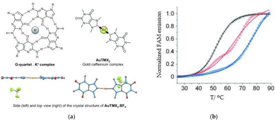 (a) Chemical structures of G-quartet (left) and [Au(9-methylcaffeine-8-ylidene)2]+ (AuTMX2) complex; (b) graph of FRET melting results of AuTMX2; 0.2 μM DNA with AuTMX2 (red curve) and withthout any ligands (black curve). Adapted with permission from Ref. []. Copyright (2012) Wiley-VCHVerlag GmbH & Co. KGaA, Weinheim.