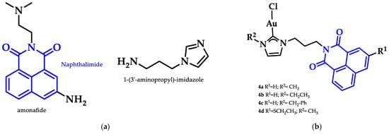 (a) Chemical structure of naphthalimide moiety and 1-(3′-aminopropyl)-imidazole ligands; (b) Chemical structures of series of Au(I)-NHC complexes with naphthimide moieties.