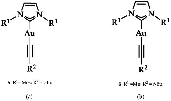 Heteroleptic NHC Au(I)-alkynyl complexes and their analogues (Figure 14) were synthesized by Oberkofler et al. They were studied in vitro and compared to cisplatin against ovarian (SKOV-3), breast (MCF-7), and skin (A375) malignant cells. Compound 5 showed increased selectivity against melanoma A375 (EC50 = 3.4 ± 0.5 μM) over cisplatin (EC50 = 3.7 ± 0.9 μM) after 72 h of incubation. However, via FRET DNA melting analysis, only compound 6 showed a noteworthy stabilization of G4 in both human telomeric DNA (hTelo, 3.51 ± 0.08 °C) and the promoter of proto-oncogene tyrosine-protein kinase (c-KIT1) (7.00 ± 0.05 °C) [].