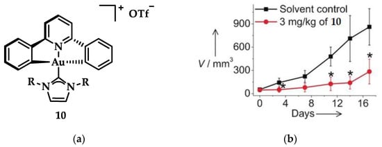 Che et al. synthesized another series of Au(III) complexes with pincer ligands displaying strong and selective in vitro cytotoxicity and anticancer in vivo activity against mice carrying xenografts of human cervical and lung cancer. The mode of action of the Au(III)-NHC compound was verified using clickable photoaffinity probes that helped to identify the complexes’ interaction with intramolecular protein target molecules. One of the main targets, nucleophosmin, is an upregulating protein in cancer cells interacting with a positive regulator of tumor suppressor p53; this protein is involved in DNA replication and ribosome biogenesis. The micro dosing treatment of compound 10 (Figure 17a) in HeLa cells demonstrated a progressive formation of nucleophosmin monomers, increasing the expression of p53 protein levels. Che and coworkers observed that in vitro cytotoxicity against cervical (HeLa), colon (HCT116), and lung (NCI-H460) cancer cells enhanced with the increasing length of alkyl chain on NHC ligands. Antagonistic studies on HeLa cells with cisplatin and 10 indicated a greater reduction of spheroid growth by 10 (10: 70%, cisplatin: 30%). The same compound in in vivo studies using HeLa cells (Figure 17b) with 3 mg·kg−1 dosing showed an inhibition of growth at 71%, while NCI-H460 cells with the same dosage showed a 53% growth inhibition, without any adverse effects on body weight. Based on a series of compounds using 10 as a scaffold, an increased cytotoxicity against all the aforementioned cancer lines was observed with increasing alkyl chain length of R [].