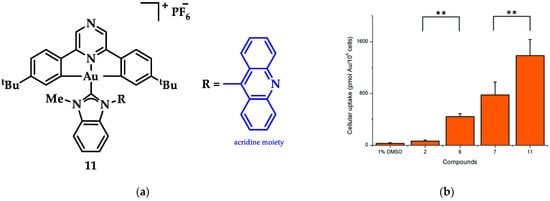 (a) Acridine-functionalized [(C^Npz^C)AuIII(NHC)]+ complex; (b) Cellular uptake in MCF-7 cells (compound 11). ** p < 0.005. Adapted with permission from Ref. []. Copyright (2018) The Royal Society of Chemistry.