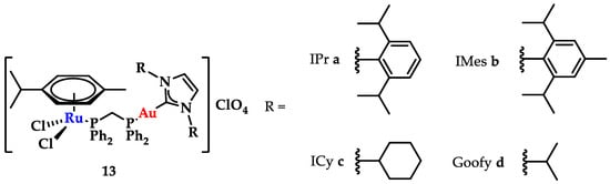 NHCs show limited DNA interaction, unless rationally designed to target and interact with DNA quadruplexes []. However, through a combination with other metals, new avenues in drug design can be explored. Contel and coworkers synthesized a series of heterobimetallic Ru-Au complexes (Figure 20) with potent anticancer activity []. Based on screening against renal (Caki-1), colon (HCT 116 and DLD1), and non-tumorigenic kidney (HEK-293T) cell lines against cisplatin, heterobimetallic compounds 13a–d indicated a high cytotoxicity against malignant cells, while they were less toxic toward healthy cells. Gel electrophoresis studies using plasmid DNA showed only a weak effect on DNA supercoiling, even when the compound concentration was increased, and a weak DNA interaction via a non-intercalative binding [].
