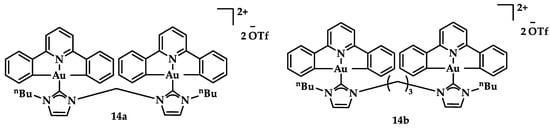 Dianionic [C^N^C]2− auxiliary NHC ligands were employed in the synthesis of Au(III) complexes by Che et al., displaying a potential anticancer activity in vitro and in vivo. Compounds 14a and 14b (Figure 21) showed promising anticancer activity against hepatocellular carcinoma (HepG2) with IC50 value 7.9 ± 0.6 μM and 1.1 ± 0.1 μM, respectively, while 13b displayed cytotoxicity against camptothecin-resistant cells (KB-CPT-100) with an IC50 value of 12 ± 1.3 μM; further, 14a displayed low cytotoxicity against the non-cancerous lung fibroblast cells (CCD-19Lu) with a value > 100 μM [].