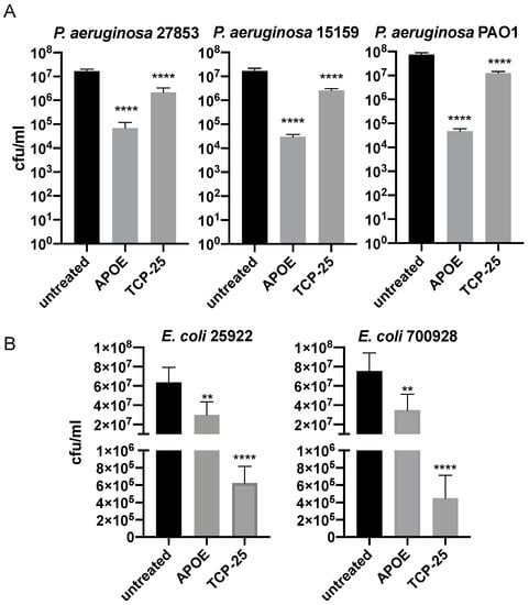 Figure 1. Antimicrobial activity of APOE in vitro.P. aeruginosa (A) and E. coli (B) were incubated with 2 µM APOE for 2 h and then viable count assay was performed. Thrombin-derived peptide 2 µM TCP-25 was used as a positive control, whereas the untreated bacteria were used as negative control. Data are presented as the mean ± SEM of four independent experiments (n = 4). Statistical analysis was performed using a one-way ANOVA with Dunnett’s multiple comparison tests, ** = p ≤ 0.01 and **** = p ≤ 0.0001.