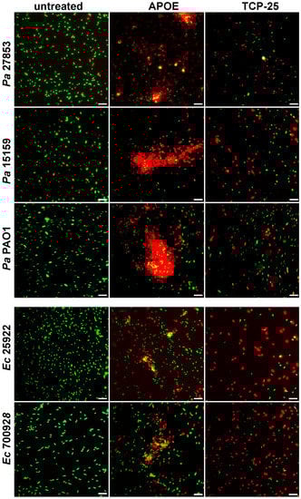 Figure 2. Visualization of E. coli and P. aeruginosa viability. Live/Dead Viability Assay of Gram-negative bacteria stimulated with 2 µM APOE, 10 mM Tris buffer at pH 7.4 (negative control) or 2 µM TCP-25 (positive control). Representative images from three independent experiments are presented (n = 4). At least ten individual fields were acquired per experiment. Live bacteria were stained with green SYTO 9 nucleic acid fluorescent dye, and dead bacteria were stained using red propidium iodine dye. Scale bar represents 5 µm.
