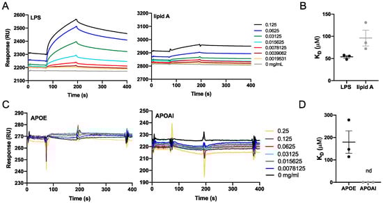 Figure 3. Biacore binding analysis. Binding interactions between the analytes and immobilized APOE protein or LPS. (A,B) Sensorgrams that show the response unit plotted as a function of time for LPS and lipid A or for APOE and APOAI. (C,D) Dissociation constants (KD) of protein–ligand interactions were calculated from the sensorgrams (nd = not detected).